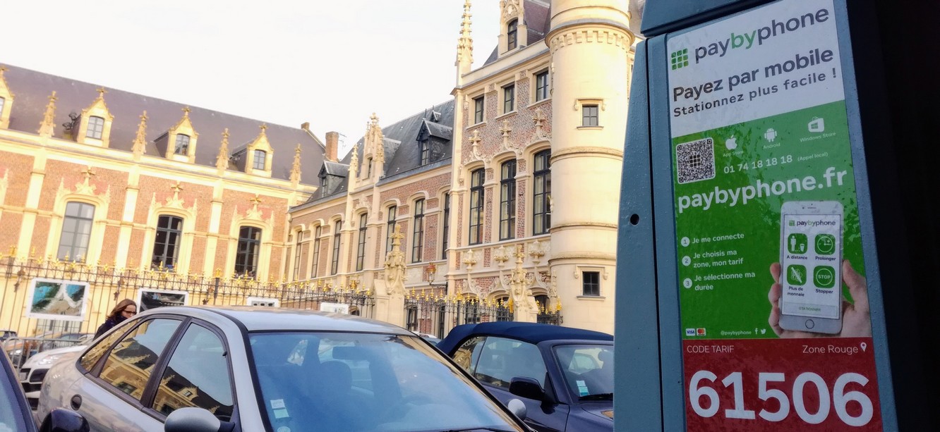 Première étape : changer mes habitudes et éviter le stationnement gratuit place du Barlet ou encore le parking du Passage Gayant. Il me faut donc trouver une place payante. Direction l'hyper-centre, dans la zone de tarif dite "rouge". Je trouve une place dans la rue Saint-Jacques. Je jette un coup d'oeil à l'horodateur. Il me suffit alors d'ouvrir l'application "PayByPhone" sur mon téléphone et de suivre les indications. Au préalable, j'avais déjà téléchargé et installé l'application de chez moi et configuré mon véhicule ainsi que ma carte bancaire.