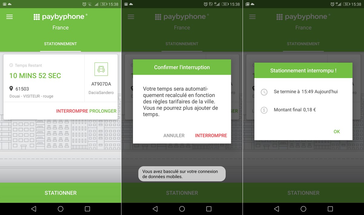 Une nouvelle fenêtre s'ouvre "Stationnement interrompu !" Se termine à 15:49 Aujourd'hui, Montant final 0,18 EUR.