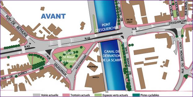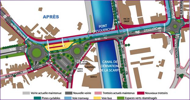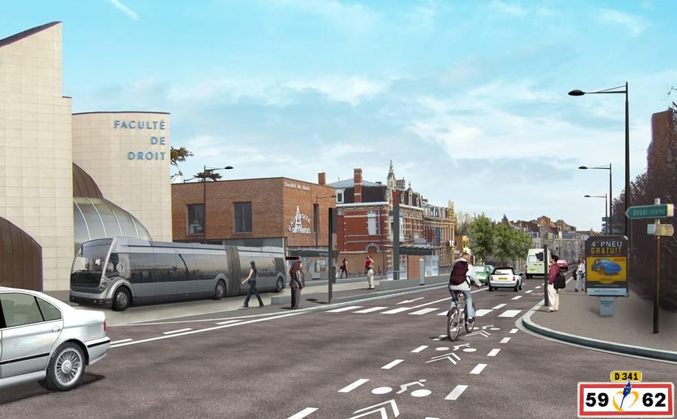 Comme vous le savez sans doute déjà, le tramway desservira le boulevard de la République (sous-préfecture, cinéma le Majestic), la faculté de droit, la DRIRE, l’École des Mines, le lycée Edmond Labbé et l’école des bateliers. Afin de rendre possible l’arrivée du tramway, des travaux d’une durée de onze mois vont avoir lieu dans le secteur du pont d’Esquerchin. Ils vont entraîner un réaménagement complet des lieux : création de trois giratoires, construction d’une station de tramway et de bus, aménagement d’un parc relais pour les usagers des transports en commun et mise en place de pistes cyclables.